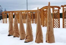 В настоящее время усиленно рекламируют в качестве укрывных материалов использовать нетканый материал - лутрасил, спанбонд или тайвек. Существуют мнения, (кстати, подтвержденные практикой), что под подобным укрытием создается неблагоприятный микроклимат, в частности, - повышенная влажность воздуха. Конечно, попробовать можно. Но нужно сделать так, чтобы этот материал не соприкасался с хвоей или с листьями. Многочисленные попытки такого укрытия показали, что в местах сопрокосновения происходит либо подопревание хвои и листьев, либо изменение их окраски в результате различных ожогов. Кроме того, укрывая нетканым материалом, помните: он не должен доходить до земли. В нижней части растения должны обязательно проветриваться.
