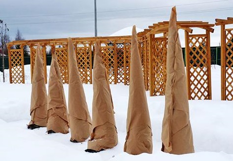 Можно пользоваться еловым лапником. Установив над растением деревянный или металлический каркас, лапник раскладываете поверх него. При этом основания веток связываете и закрепляете наверху проволокой или бичевкой. Этот способ хорош тем, что нижняя часть кустов, корневая шейка проветриваются и не подпревают.
