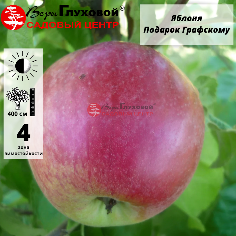 Описание Яблоня Подарок Графскому. Плоды крупные, разнокалиберные, часто более 200 граммов, иногда до 350. Форма их неровная, а кожица красивая, гладкая и очень яркая. Она покрыта интенсивным красно-фиолетовым румянцем и восковым налетом. Оржавленности на поверхности яблок нет.