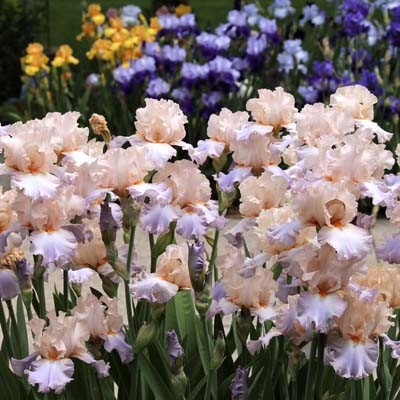 Сегодня мы расскажем об ирисе Селебрейшен Сонг (Selebration Song). Ещё одно название «бородатый ирис», которое цветок получил благодаря своей форме. Выведен данный сорт в 1993 г. и достигает 100 см в высоту, 35 см в объёме. Красоту цветы сохраняют до осени. Верхние лепестки имеют белоснежный окрас, с еле заметным бежевым оттенком, а нижние имеют светло-сиреневый налёт, с яркой красно-оранжевой бородой. На цветоносе в период созревания образуются по 9-12 бутонов. Цветки обладают тонким ароматом и способны украсить любой участок. Цветет в мае-июне, на протяжении 3-4 недель. Скоро мы расскажем о следующем сорте нашей коллекции.